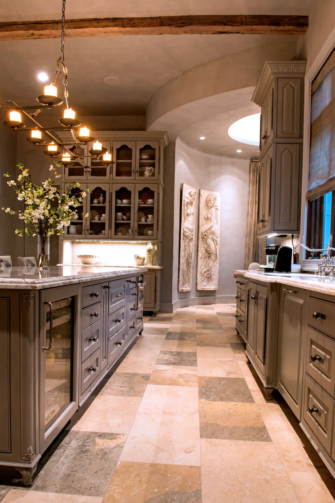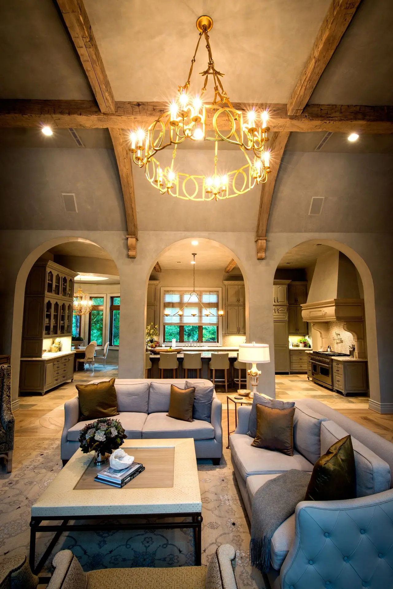 Within the recreation center, structural and decorative timber elements help soften the scale of the space while adding character and texture. From vaulted brick ceilings in the expansive living space to the coffered ceiling of the games room and a Tuscan-style pavilion with a beamed roof, reclaimed beams play a central role.